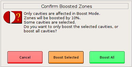 Use this mode to temporarily increase the power to the cavities. Manifolds are not affected by boost mode. You can't access boost mode during manifold preheat or during the startup sequence. The amount and duration of boost is determined by the user in the setup dialog. When the boost mode button is pressed, you are asked to confirm that you want to place the cavities in boost mode. If any cavities were selected before you pressed the boost button, you also have the option to boost only the selected zones, or to boost all the cavities. ![]() Once boost mode is activated, the boost mode dialog appears, which shows the boost mode timer. When the timer reaches zero, boost mode will automatically end and the controller will return to normal operation. ![]() You can increase the boost duration in one minute intervals, or quit boost mode early. In